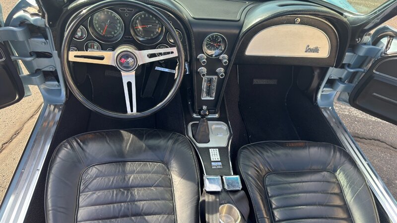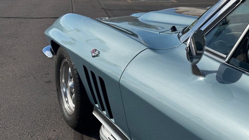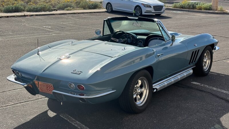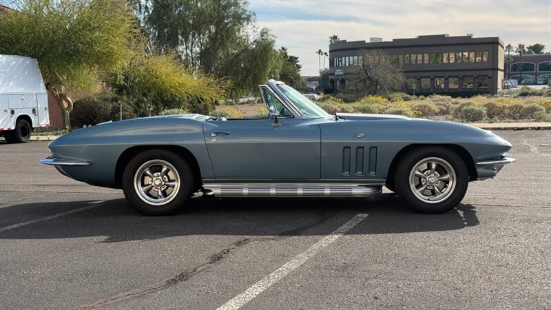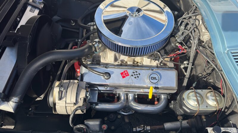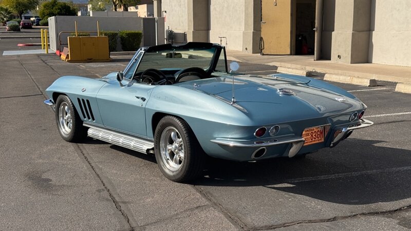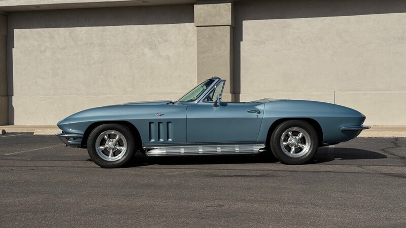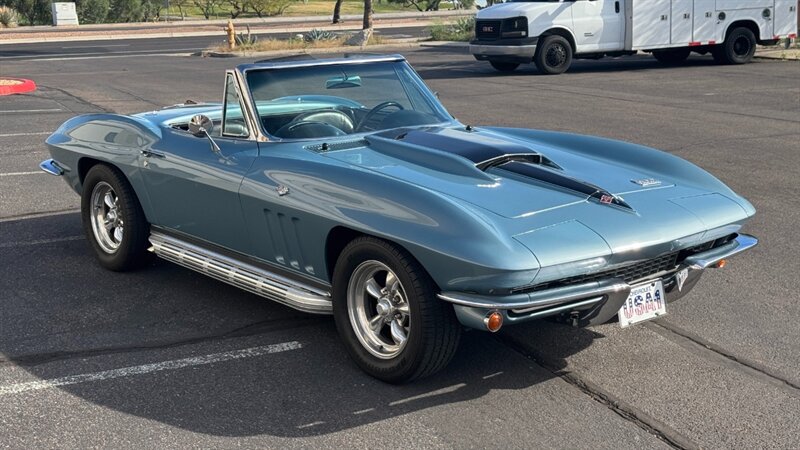 The C2 Generation Corvette, immortalized as the "Sting Ray," stands as one of the most significant triumphs in American automotive design. With its wind-tunnel-tuned curves and independent rear suspension, it was the moment the Corvette matured from a fiberglass roadster into a genuine world-class sports car. The 1966 model year is particularly revered for refining this formula, offering a balance of aggression and elegance that few cars have matched since. This particular example takes that iconic silhouette and injects it with a "day two" attitude, blending the timeless lines of the mid-60s with a powertrain selected for modern driveability and visceral acoustic feedback. The cocktail gets more potent when you examine the mechanical specification. While it retains the spirit of the original small block, the engine bay is now home to a 350-cubic-inch crate V-8, breathing deeply through a Holley 4-barrel carburetor and a Weiand intake manifold. The soundtrack is uncorked via McJacks shorty headers feeding into unmistakable side pipes—a setup that provides the visual and auditory drama that defines the muscle car era. Crucially, the driving experience has been modernized for highway touring; the V-8 is backed by a 700R4 4-speed automatic transmission, offering an overdrive gear that transforms this Corvette from a quarter-mile sprinter into a comfortable long-distance cruiser. Cooling is managed by a BeCool aluminum radiator, while handling and stopping are refined by power steering and four-wheel disc brakes. The example offered here is finished in brilliant Laguna Blue, a hue that perfectly accentuates the Sting Ray’s complex surfacing. The exterior aggression is dialed up with the addition of a 1967-style Big Block hood, highlighted by a sharp black "stinger" stripe that draws the eye from the nose to the cowl. Paint is considered in excellent condition with brilliant luster. On a scale to ten, we rate this paint as a solid 9. This Sting Ray rides on 15-inch American Racing aluminum wheels wrapped in BFG Radial T/A rubber, giving it a low, purposeful stance. The look is capped by a like-new white canvas convertible top that provides a crisp contrast to the bodywork. Inside, the cabin remains true to its roots with a Code 418 Black vinyl interior. The bucket seats, door panels, and dash are clean and well-preserved, maintaining the focused, cockpit-style layout the C2 is famous for. A center console anchors the space, and while the shifter may visually suggest a manual lineage, it commands the automatic transmission with ease. Rounded out by a classic AM/FM radio, this Corvette offers the best of both worlds: the undeniable curb appeal of a side-pipe Sting Ray with the effortless usability of a sorted, automatic cruiser.